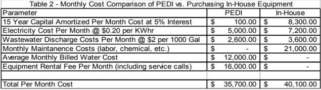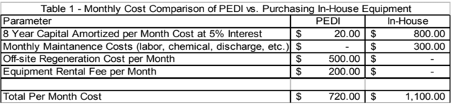 The end user opted to outsource their water treatment to the service provider. They agreed on a contract that incorporated a fixed monthly fee for the on-site trailers and $ per 1,000 gallons of water treated. Both companies shared capital costs of approx. $4,000. The PEDI company performs monthly service calls for preventive maintenance on the RO, membrane cleanings, etc. The resin trailer is exchanged approximately 4 or 5 times per year and is processed at the central regeneration facility. Frequency of trailer exchange varies on water usage and the ionic loading from the RO. Table 2 compares the monthly operating costs of contracting a PEDI service provider vs. purchasing in-house equipment.